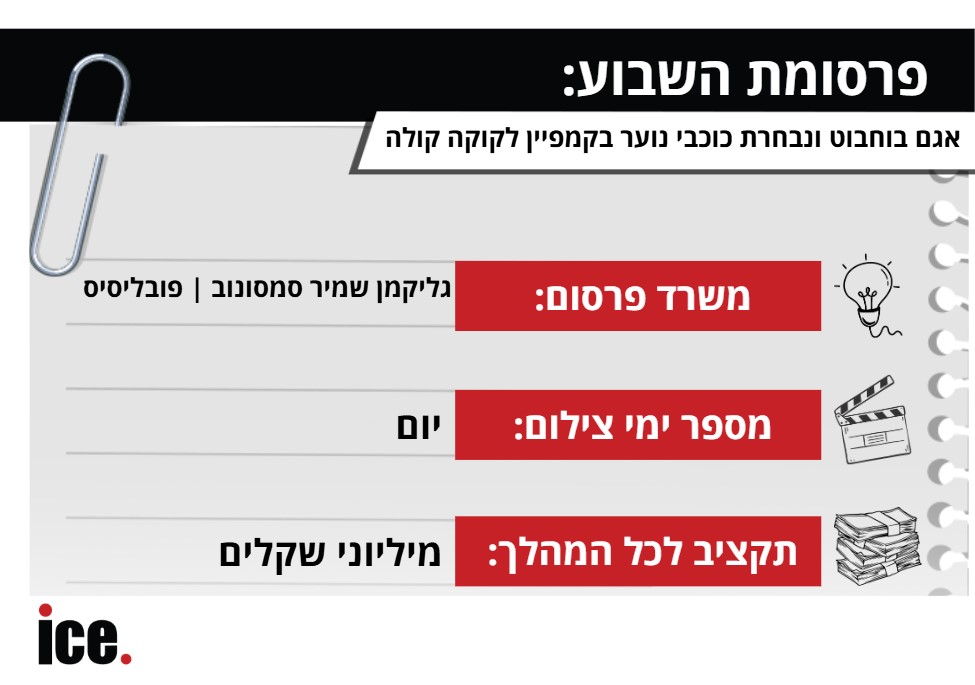 הפרסומת החדשה של קוקה קולה משכה את תשומת ליבם של גולשים רבים ברשתות החברתיות. בקמפיין החדש שפורסם במדיה החברתית ובערוצי הטלוויזיה מככבים הזמרת אגם בוחבוט ונבחרת כוכבי רשת פופולריים.