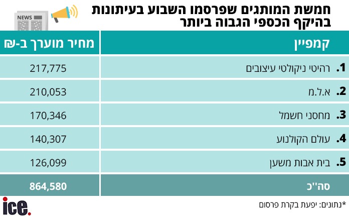 היקף תקציב הפרסום בעיתונות ירד השבוע ועמד על כ-864 אלף שקל, לעומת כ-956 אלף שקל בשבוע שעבר. רהיטי ניקולטי תוקעים יתד במקום הראשון, זה שבוע שני ברציפות עם השקעה של כ-217 אלף שקל. במקום השני נמצאת חנות האלקטרוניקה א.ל.מ עם מבצעי סוף שנה, בהשקעה של כ- 210 אלף שקל בפרסום. במקום השלישי נמצאים מחסני חשמל, שגם כן מפרסמים את מבצעי סוף השנה עם השקעה של כ-170 אלף שקל. במקום הרביעי, עולם הקולנוע עם מהפכת מחירים, בהשקעה של כ-140 אלף שקל ובית האבות משען סוגרים את הרשימה עם השקעה של כ-126 אלף שקל.