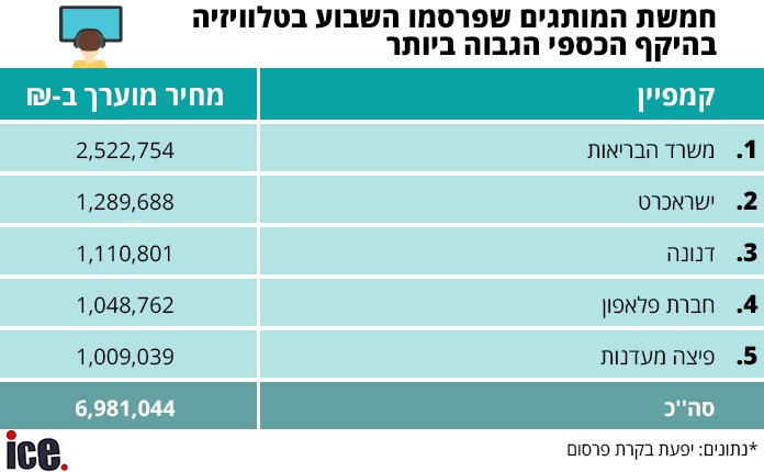 לפי נתוני יפעת בקרת פרסום, חמשת המותגים שהובילו את טבלת הפרסום השבוע בטלוויזיה, עם השקעה של כ-6.9 מיליון שקל, עלייה של כ-2 מיליון שקל מהשבוע שעבר הם: משרד הבריאות שהשקיע סכום גבוה של כ-2.5 מיליון שקל, עבור עידוד ההתחסנות. במקום השני נמצאת ישראכרט שהשקיעה כ-1.2 מיליון שקל בפרסומת על אפליקציית התשלומים החדשה שלה. במקום השלישי, דנונה שהשקיעה כ-1.1 מיליון שקל על פלא היוגורט. חברת פלאפון משיקה את מכשיר האייפון החדש עם הנחות טרייד אין, בהשקעה של כ-מיליון שקל. חברת המזון מעדנות סוגרת את הרשימה עם הפיצה החדשה באריזה שחורה, גם כן בהשקעה של כ-מיליון שקל.