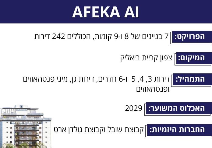 במתחם AFEKA AI שבעה בניינים של 8 ו-9 קומות, ו-242 דירות בתמהיל מגוון: דירות 3 עד 6 חדרים, דירות גן, מיני פנטהאוזים והדובדבן שבקצפת, 7 פנטהאוזים מפוארים עם בריכת שחייה פרטית – מוצר שאין דומה לו בשכונה. עוד יציע הפרויקט לובאים מרווחים ומעוצבים, ומועדוני דיירים רב-תכליתיים המתוכננים לשמש כמרחבי מפגש, עבודה ופנאי. עבודות החפירה והדיפון צפויים לצאת לדרך בזמן הקרוב, כשהצפי המשוער לאכלוס הוא 2029.