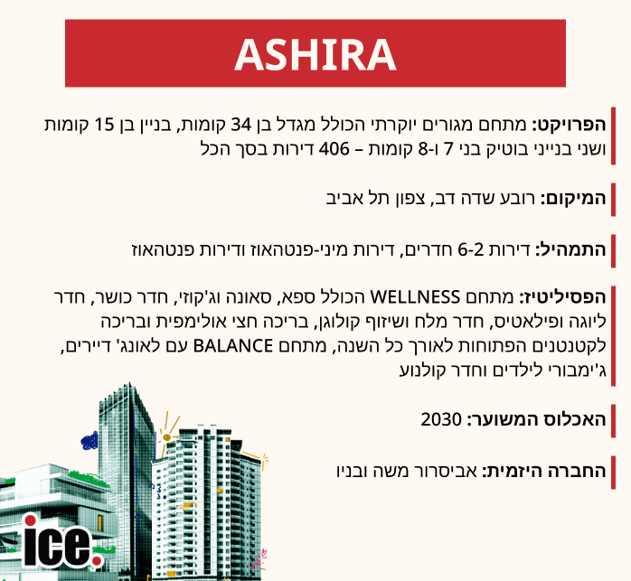 פרויקט ASHIRA ממוקם במתחם אשכול, המתחם הראשון שנבנה בשדה דב, והוא מציע סטנדרט חדש של מגורי יוקרה. 4 בניינים בבנייה מרקמית – מגדל בן 34 קומות, בניין בן 15 קומות ושני בנייני בוטיק בני 7 ו-8 קומות – ובסך הכל 406 דירות. בהקשר הזה צריך גם להבהיר כי בעקבות הודעת המשרד להגנת הסביבה ורמ"י על חשד לזיהום קרקעות בשדה דב, נערכה לאחרונה בדיקה, שממצאיה העלו כי השטח עליו נבנה פרויקט ASHIRA נקי ולא היה נגוע מלכתחילה.