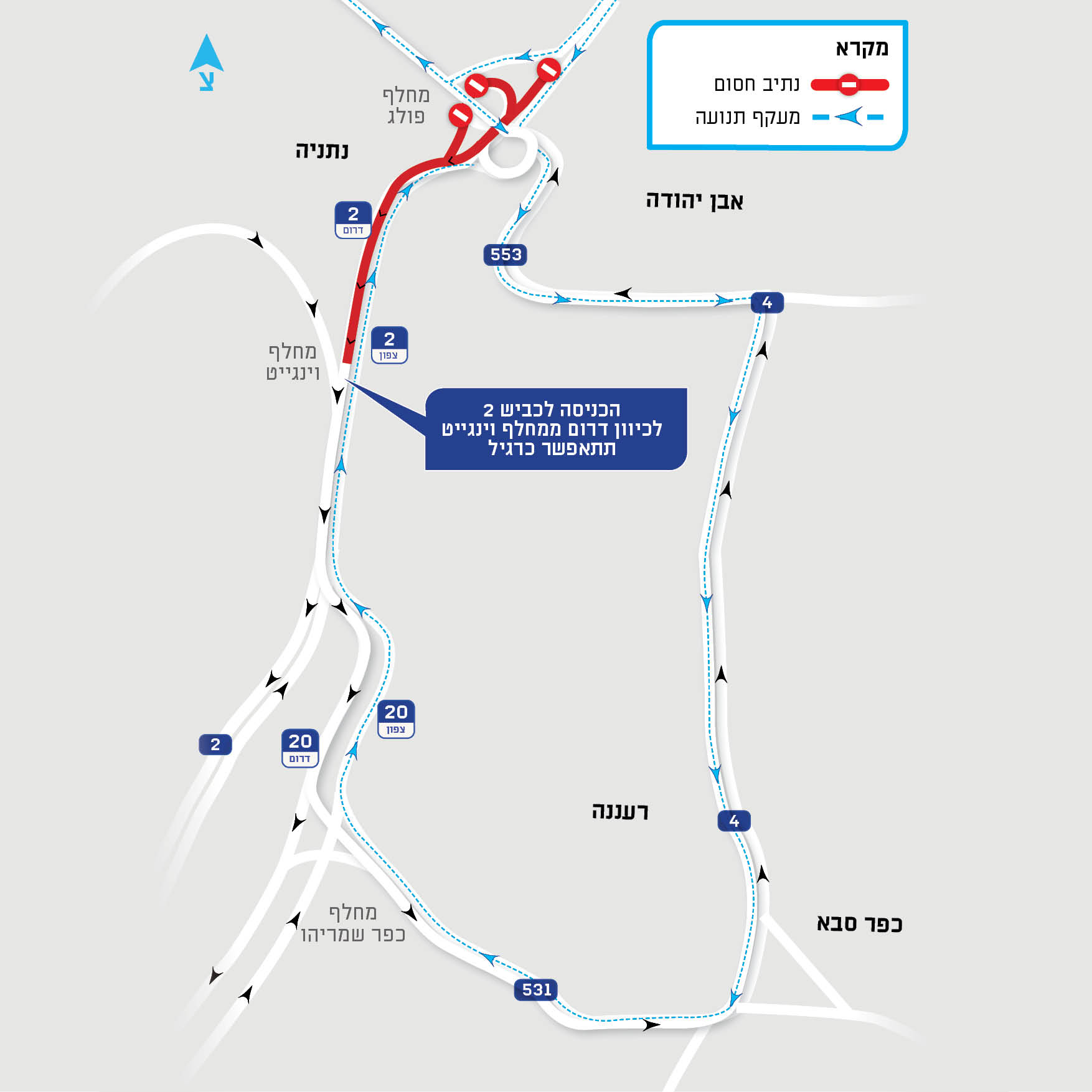 במהלך העבודות לא תפעל תחבורה ציבורית בקטע הנ"ל. הכניסה ממחלף פולג לכביש 2 לנוסעים בכיוון דרום תיחסם, והתנועה תוסט לכביש 553 ובהמשך לכביש 4. הכניסה ממחלף פולג לכביש 2 לנוסעים בכיוון צפון תתאפשר כרגיל. הכניסה ממחלף וינגייט לכביש 2 לנוסעים בכיוון דרום תתאפשר כרגיל