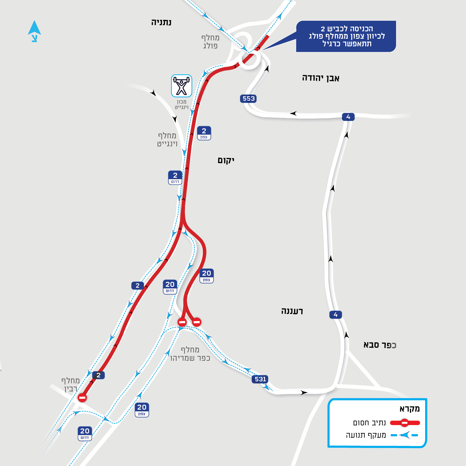 * הכניסה ממחלף פולג לכביש 2 לנוסעים בכיוון צפון תתאפשר כרגיל.