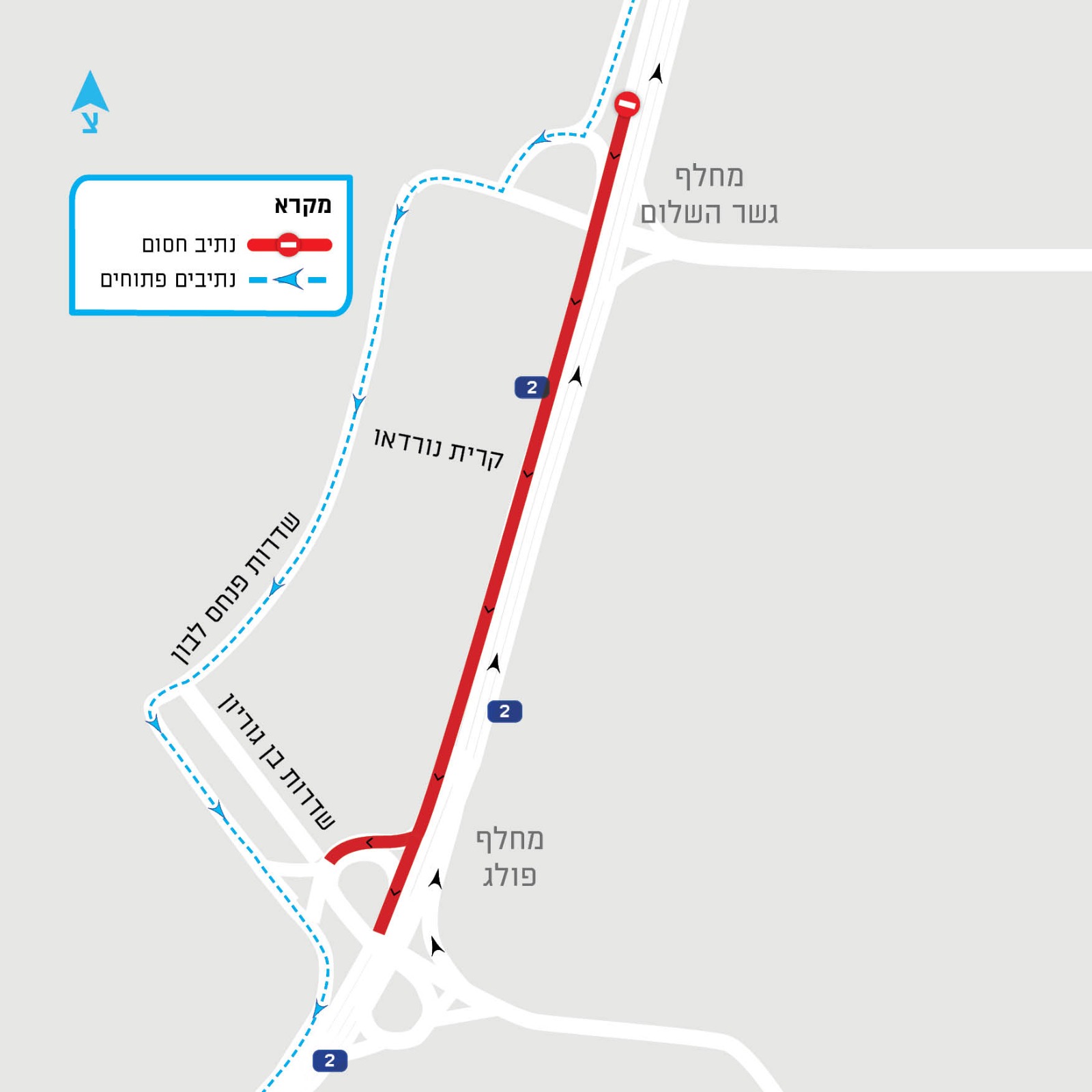 הסדרי התנועה בעת החסימה: כביש 2 ייחסם לתנועה לנוסעים בכיוון דרום, בין מחלף גשר השלום בנתניה למחלף פולג. יש לציין כי במהלך העבודות לא תפעל תחבורה ציבורית בקטע הנ"ל.
