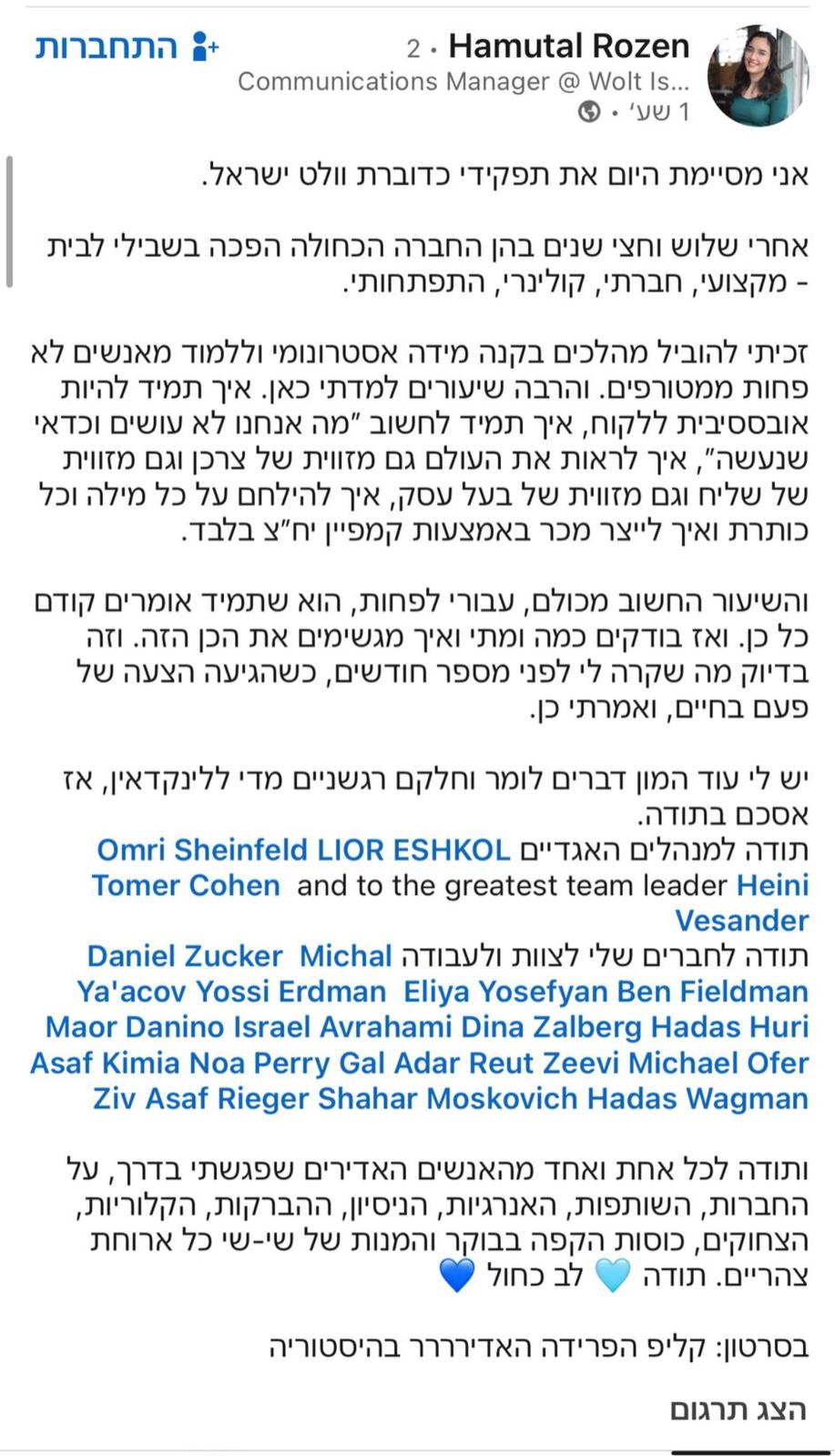 בפוסט שפרסמה בחשבון הפייסבוק, שלה כתבה חמוטל רוזן, דוברת וולט ישראל היוצאת: "זכיתי להוביל מהלכים בקנה מידה אסטרונומי וללמוד מאנשים לא פחות ממטורפים. תודה למנהליים האגדיים, לחברים שלי לצוות ולעבודה. תודה לכל אחת ואחד מהאנשים שפגשתי בדרך על החברות, השותפות, האנרגיות והניסיון".