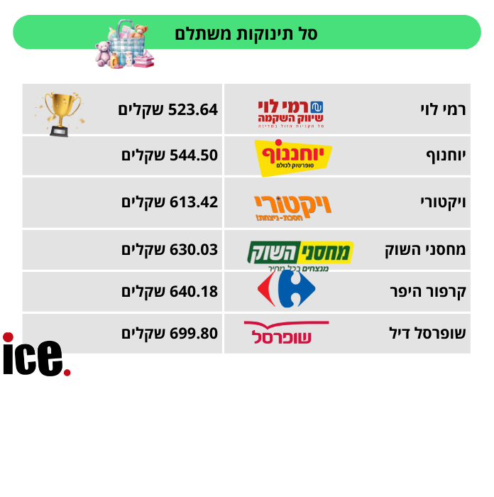 ice בדק ומצא באמצעות אתר פרייסז, איזה סל תינוקות הוא המשתלם ביותר וגילה פערים של 176 שקלים בין הסל הזול ביותר ליקר ביותר