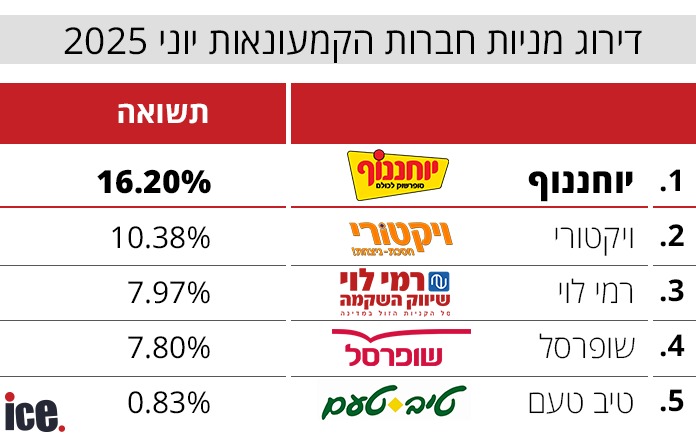 מניית יוחננוף ממשיכה להוביל את הענף, עם עלייה של 16.2% ביוני וזאת לאחר שזכתה גם לתשואה במאי של 11.75%. רשת ויקטורי שומרת על המקום השני, עם זינוק נוסף גם החודש - 10.38%. רשת רמי לוי, שתשואת מנייתה הייתה הנמוכה ביותר בחודש מאי (5.07%), רושמת החודש התאוששות מרשימה עם עלייה ב-7.97% נוספים.