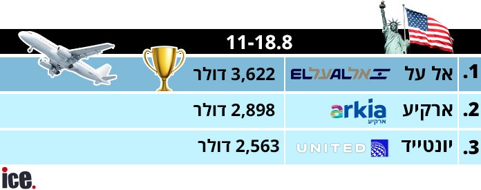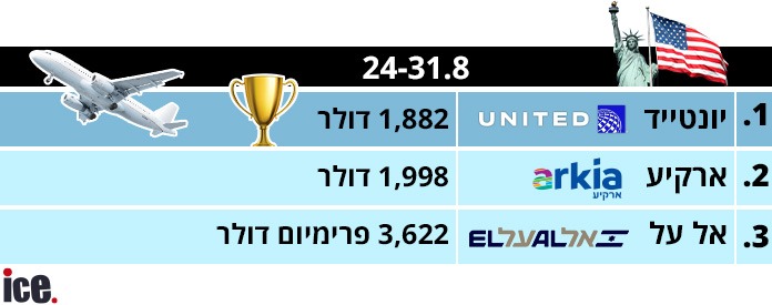 גם בחודש אוגוסט המחירים לא מרפים: הטיסה הזולה ביותר שוב דרך יונייטד, אך המחיר קופץ ל־2,563 דולר (כ־8,500 שקל), כמעט פי 2.5 מהמחיר ביולי. המחיר הגבוה ביותר נרשם עבור טיסה במחלקת פרימיום בעלות של 3,622 דולר (כ־12,000 שקל).