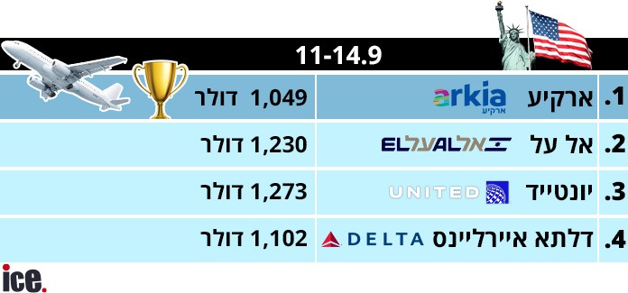 ואכן, בבדיקת ice לחודש ספטמבר, ניתן כבר למצוא טיסה לניו יורק עם חברת התעופה הישראלית ארקיע, במחיר של 1,049 דולר בלבד – בשורה מרעננת אחרי חודשים של עלויות חריגות והיצע מוגבל.