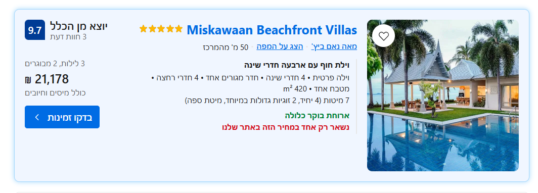 במהלך החופשה בתאילנד והצילומים שוהים כל המשתתפים בריזורט היוקרתי שנקרא Miskawaan Beachfront Villas. לקראת הפרק שישודר הערב (שלישי) בקשת 12, בדקנו כמה יעלה לכם לשהות באתר המדובר. מחיפוש ב-BOOKING, ניתן לומר שלילה אחד שם הוא לא זול בכלל. אמנם מדובר בהזמנה של וילה ל-4 אנשים, אך גם היא נחשבת ליחסית יקרה. על פי BOOKING לחופשה של 4 ימים ו-3 לילות, תוכלו לשהות בווילה היוקרתית בתמורה ל-21,178 שקלים. ללילה אחד המחיר הוא 5,718 שקלים.
