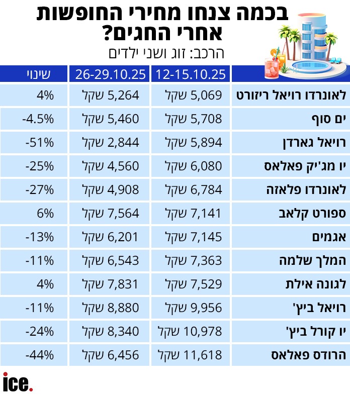 בבדיקה שערכנו מול מלונות של רשת פתאל ורשת ישרוטל, בין לפני החג השני בתאריכים 12-15.10.25 לבין ה-26-29.10 להרכב של זוג ושני ילדים.
