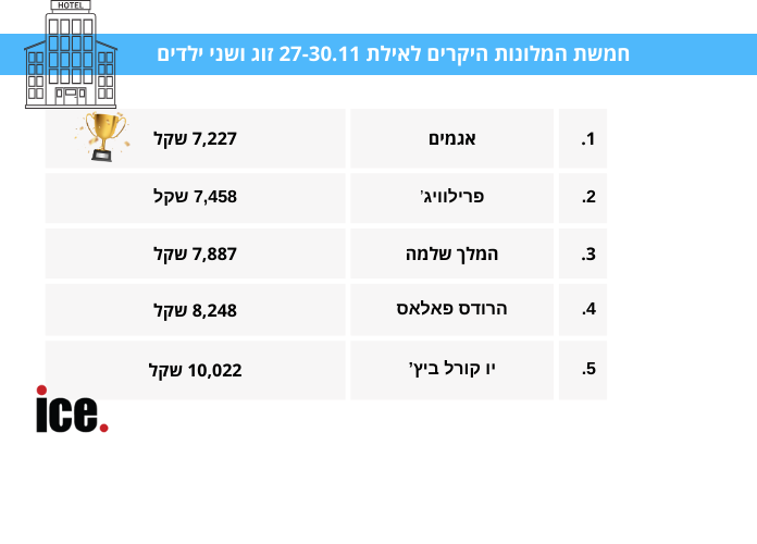 חופשות הופכות להיות משתלמות יותר בעלויות בתקופה זו, גם מבחינת מחיר וגם המזג אויר משחק לטובת הנוסעים. לשם כך, בדקנו מהם חמשת המלונות המפנקים והיקרים ביותר באילת לסופ"ש הקרוב. התאריכים שנבדקו היו 27-30.11 עבור משפחה ממוצעת של זוג ושני ילדים, גילינו מגוון של מחירים.