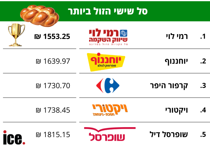 כמדי שבוע, אנו בודקים ומשווים איזו מרשתות המזון מציעה את סל הקניות המשתלם ביותר. סל שישי כולל את המוצרים היקרים והמהותיים ביותר לבית הישראלי, ולכן חשוב לבדוק היכן הוא נמכר במחיר הנמוך ביותר