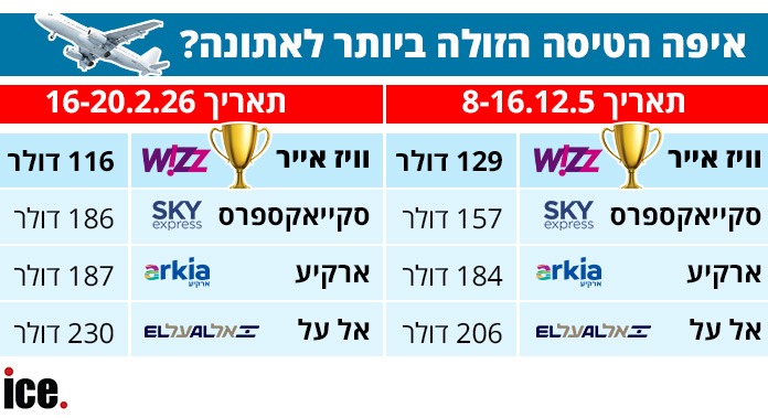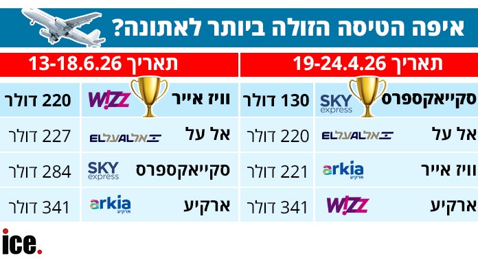 כדי להבין עד כמה המהלך ישפיע על המחירים, ערכנו בדיקה והשוואה בין מספר חברות תעופה הפעילות בקו לאתונה. סקייאקספרס ו־ Wizz Air מובילות את טבלת המחירים הזולים בתאריכים רבים, אך מפתיע לגלות שגם ארקיע הישראלית מצליחה להשיק מחירים תחרותיים, ולעיתים קרובים מאוד לאלו של חברות הלואו קוסט.