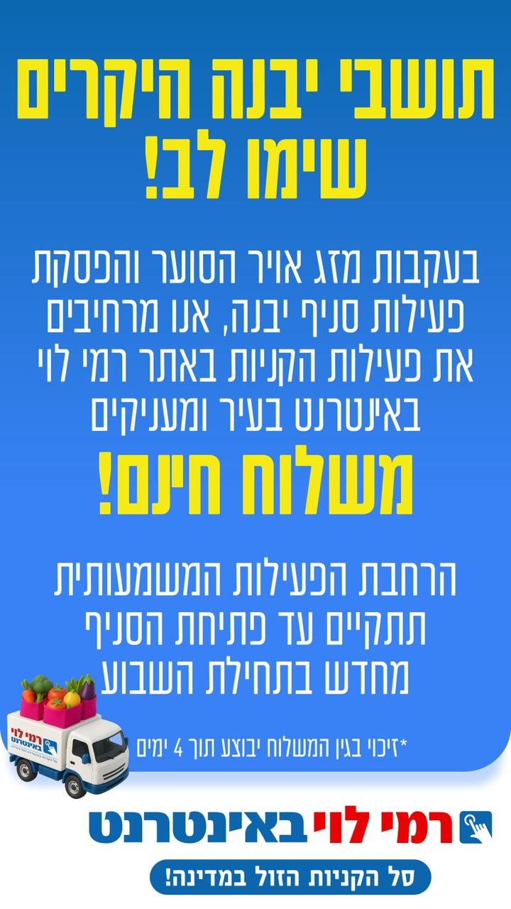 הסערה, המלווה בגשמים כבדים ורוחות חזקות, יצרה עומס חריג על מערכות הניקוז בעיר. במצב שנוצר, החליטה רשת רמי לוי להודיע על סגירת הסניף עד תחילת השבוע הבא, זאת כדי לאפשר לצוותים לטפל בנזקים, ולחזור לפעילות רק כאשר המקום יהיה בטוח ושמיש מחדש. במקביל, וכדי להקל על תושבי העיר שנפגעו מהמצב, הרשת הודיעה כי תעניק משלוח חינם לתושבי יבנה עד לפתיחת הסניף מחדש. הזיכוי עבור עלות המשלוח יבוצע עד ארבעה ימים לאחר ההזמנה.