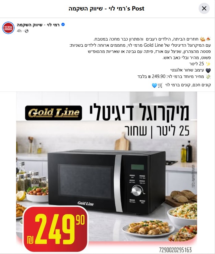 בפוסט שעלה לחשבון הפייסבוק של הרשת נכתב: "חוזרים הביתה, הילדים רעבים והפתרון כבר מחכה במטבח. עם המיקרוגל הדיגיטלי של Gold Line מרמי לוי, מחממים ארוחה לילדים בשניות: פסטה מהצהרון, שניצל עם אורז, פיתה עם גבינה או שאריות מהסופ״ש פשוט, מהיר ובלי כאב ראש".
