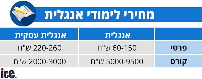 בסקירה שלנו נתייחס ללימודי אנגלית ולימודי אנגלית עסקית, ללא קורסים להכנה לבגרות. מחיר לשיעור פרטי באנגלית הינו בין 60-150 שקלים, כאשר שיעור פרטי באנגלית עסקית יעלה בין 220-260 שקלים. קורס אנגלית סטנדרטי כולל בדרך כלל 60 שעות לימוד והוא יעלה בין 5000-9500 ש"ח. קורס אנגלית עסקית לרוב קצר יותר וכולל 15-16 מפגשים בעלות שנעה בין 2000 ל-3000 שקלים.