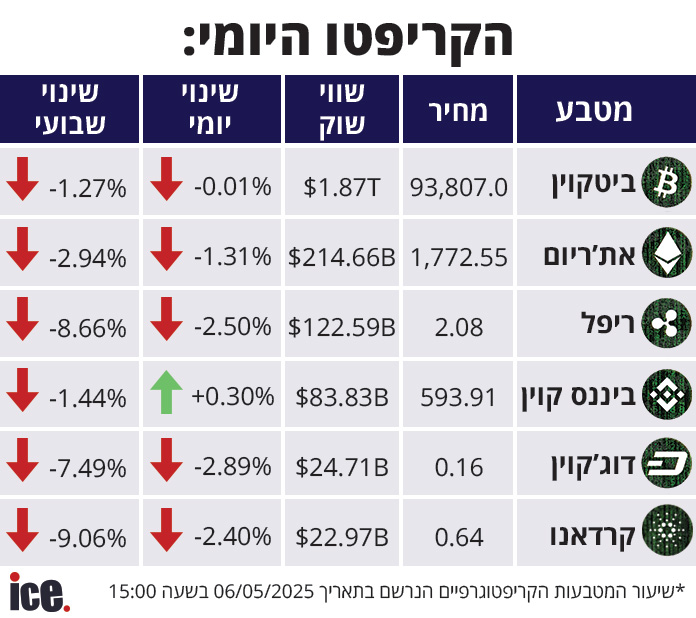 שוק מטבעות הקריפטו חווה מגמה שלילית, זאת מלבד הביננס קוין שעלה ב-0.30%. הביטקוין ירד ב-0.01%, שווי השוק שלו מסתכם ב-1.87 טריליון דולר ומחירו עומד על 93,807 דולר