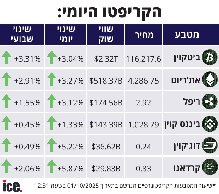 שוק מטבעות הקריפטו רושם יום חזק מאוד: הקרדאנו טס בכמעט 6%, הביטקוין והאת'ריום ביותר מ-3%. ואיזה מטבע רשם את העלייה המתונה ביותר? כל הנתונים לפניכם