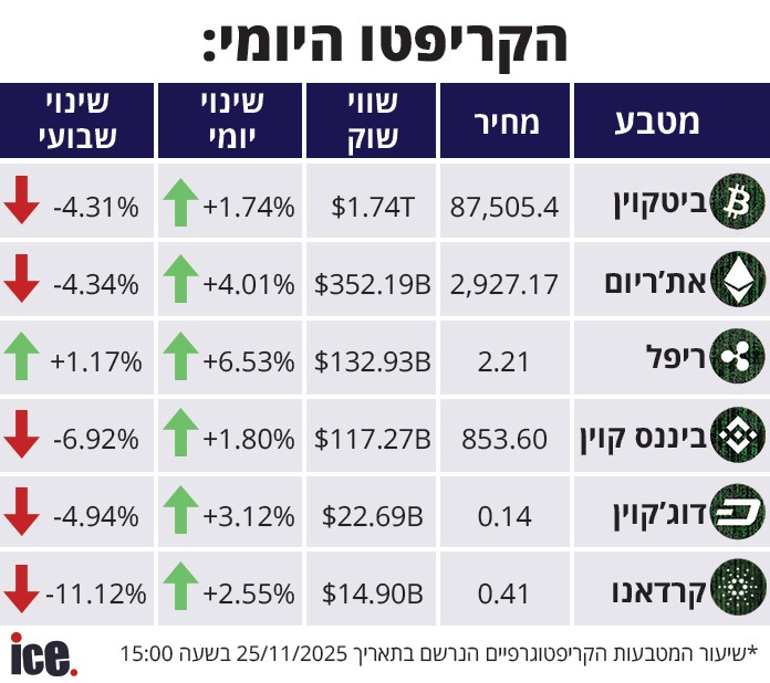 לאחר יממה של ירידה בקרב רב המטבעות הבכירים, חלה היום עליה בשוק מטבעות הקריפטו, כאשר כלל המטבעות חוו יממה של עליות. הריפל עלה בשיעור הגבוה ביותר. המטבע הבכיר ביותר הביטקוין עלה בשיעור של 1.74% לרמה של 87,505.4 דולר ליחידה ועומד על שווי שוק של 1.74 טריליון דולר.