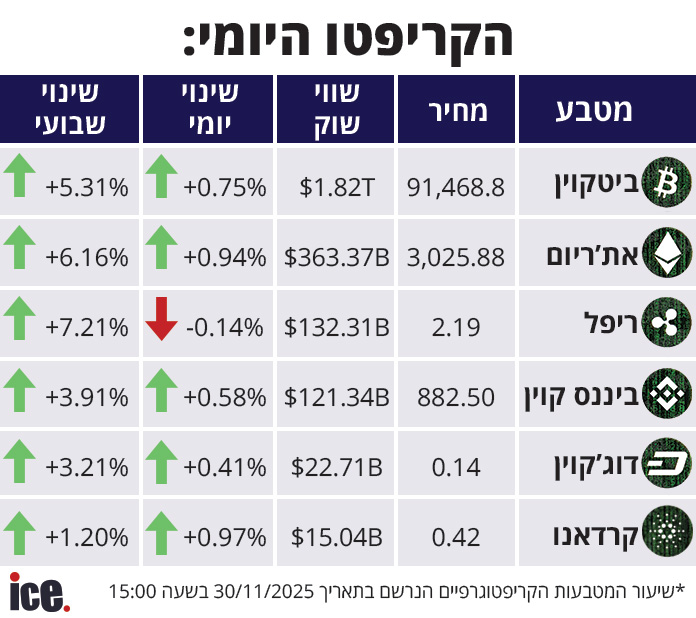 פתיחת שבוע חיובית בשוק הקריפטו: הביטקוין התחזק ב-0.75% ועלה למחיר של 91,468 דולר. למעט ריפל, שירד ב-0.14%, ערך שאר המטבעות עלה