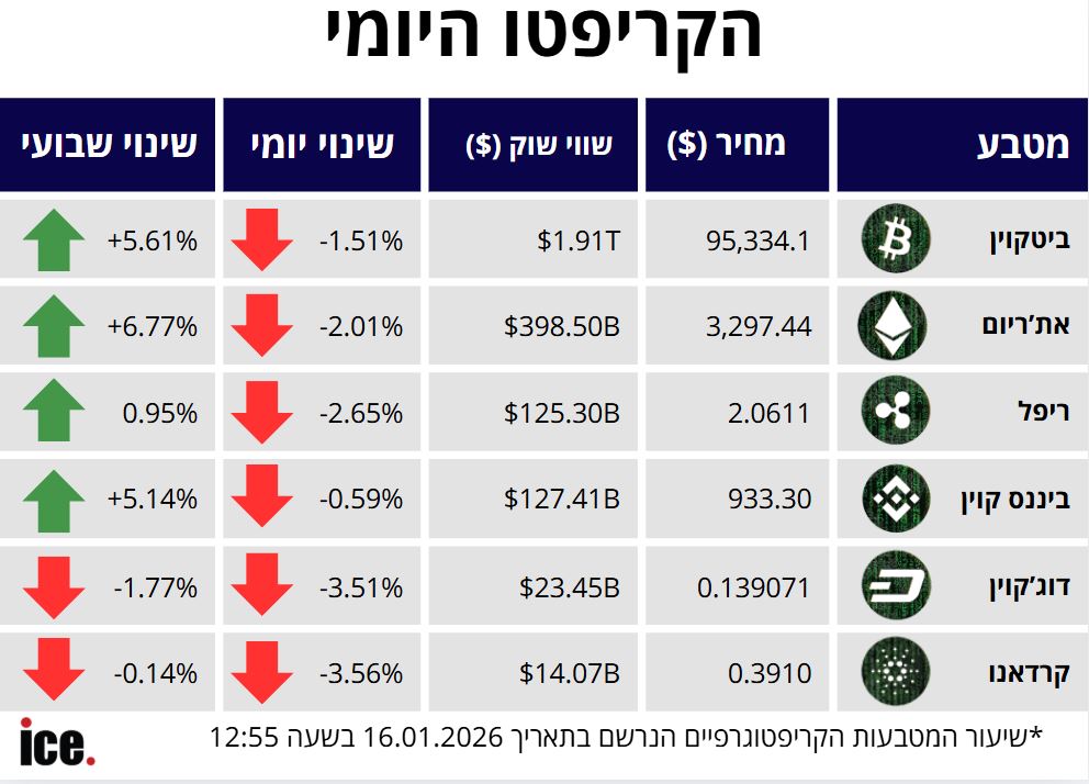 הקריפטו היומי: שוק מטבעות הקריפטו רושם היום (שישי) ירידה בכלל המטבעות המרכזיים שמסוקרים. הביטקוין, הלוא הוא המטבע החזק בשוק, רושם שינוי יומי עם ירידה של 1.51%- וכעת שווי השוק שלו עומד על 1.91 טריליון דולר