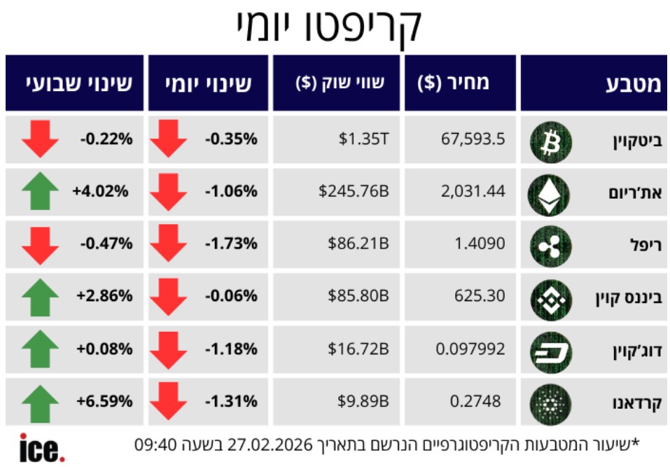 מי שרשם את הירידה השבועית הגדולה ביותר הוא הריפל, שירד ב-0.47%, כאשר שווי השוק שלו עומד כעת על 86.21 מיליארד דולר ומחירו נסחר סביב 1.4090 דולר. לעומת הריפל, הביננס קוין רשם עלייה בדמות 2.86%. כעת, מחירו של הביננס נסחר סביב 625.30 דולר ושווי השוק שלו הוא 85.80 מיליארד דולר.