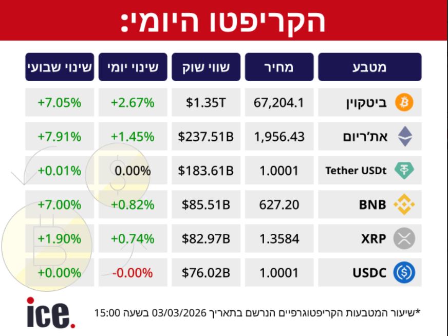שוק מטבעות הקריפטו רושם מגמה חיובית זאת מאחר שכלל המטבעות המסוקרים לא חוו ירידות. הביטקוין הלוא הוא המטבע החזק ביותר בשוק רושם את העלייה הגדולה ביותר מביניהם בדמות של 2.67% למחיר של 67,204.1 וכעת שווי השוק שלו עומד על 1.35 טריליון דולר.