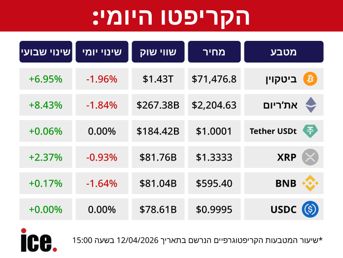 לאחר שאמש (שבת) נרשמה מגמה חיובית, היום (ראשון) נחשפו המשקיעים לשינויים שליליים בשוק מטבעות הקריפטו. במקום הראשון ניצב הביטקוין שפחת ב-1.96%, שווי השוק שלו עומד על 1.43 טריליון דולר והוא נסחר במחיר של 71,476.8 דולר. במהלך השבוע, המטבע הציג שינוי חיובי וזינק ב-6.95%.