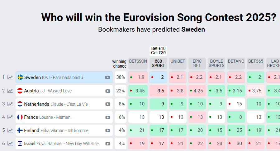 יובל רפאל דורגה במקום החמישי, אך לאחר הופעתה היא ירדה למקום השישי. הסיבה - ככל הנראה ההופעה של פינלנד, ע"פ המהמרים, הייתה מספיק מוצלחת בשביל לעקוף את ישראל. למרות שבטבלת סיכויי הזכייה של חצי הגמר, ישראל נמצאת במקום הראשון ופינלנד ואוסטריה הפייבוריטית מאחוריה, בטבלת הימורי הגמר משקללים המהמרים את הצבעת השופטים, ומעריכים כי לא יתנו ליובל רפאל ציון גבוה.