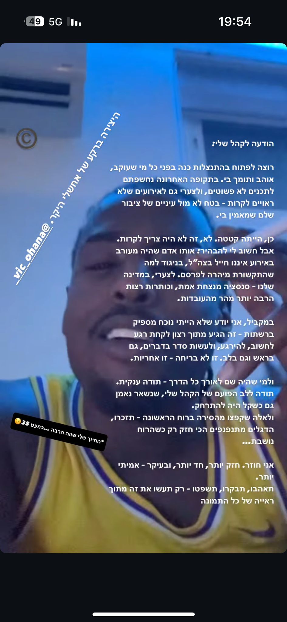 עוד לקח אחריות: "במקביל, אני יודע שלא הייתי מספיק נוכח ברשתות – זה הגיע מתוך רצון לקחת רגע לחשוב, להירגע, לעשות סדר בדברים, גם בראש וגם בלב. זו לא בריחה -זו אחריות". "באלישג" הודה לקהל הנאמן שהיה מעורב גם ברגע הלא פשוט: "ולמי שהיה שם לאורך כל הדרף - תודה ענקית. תודה ללב הפועם של הקהל שלי, שנשאר נאמן גם כשקל היה להתרחק".
