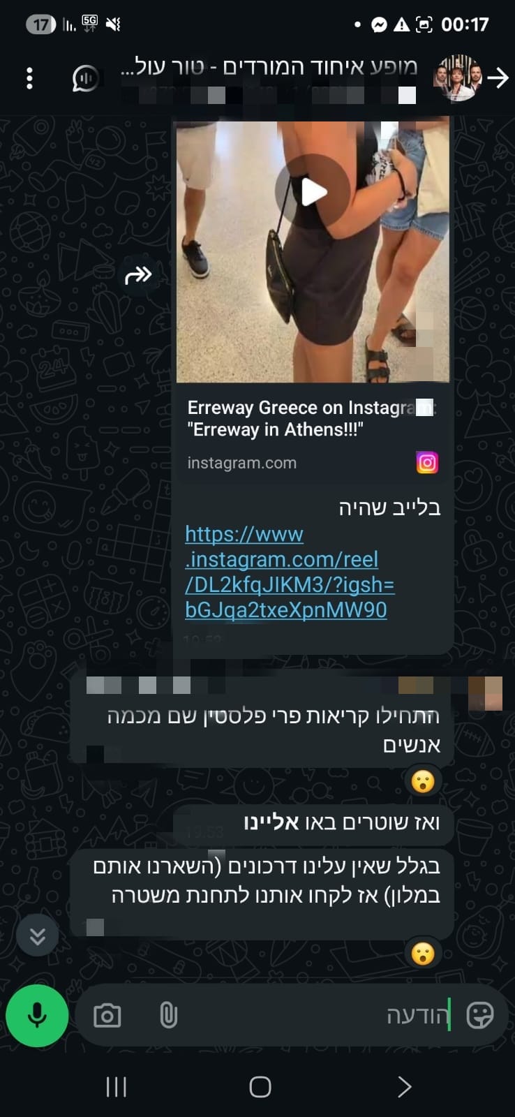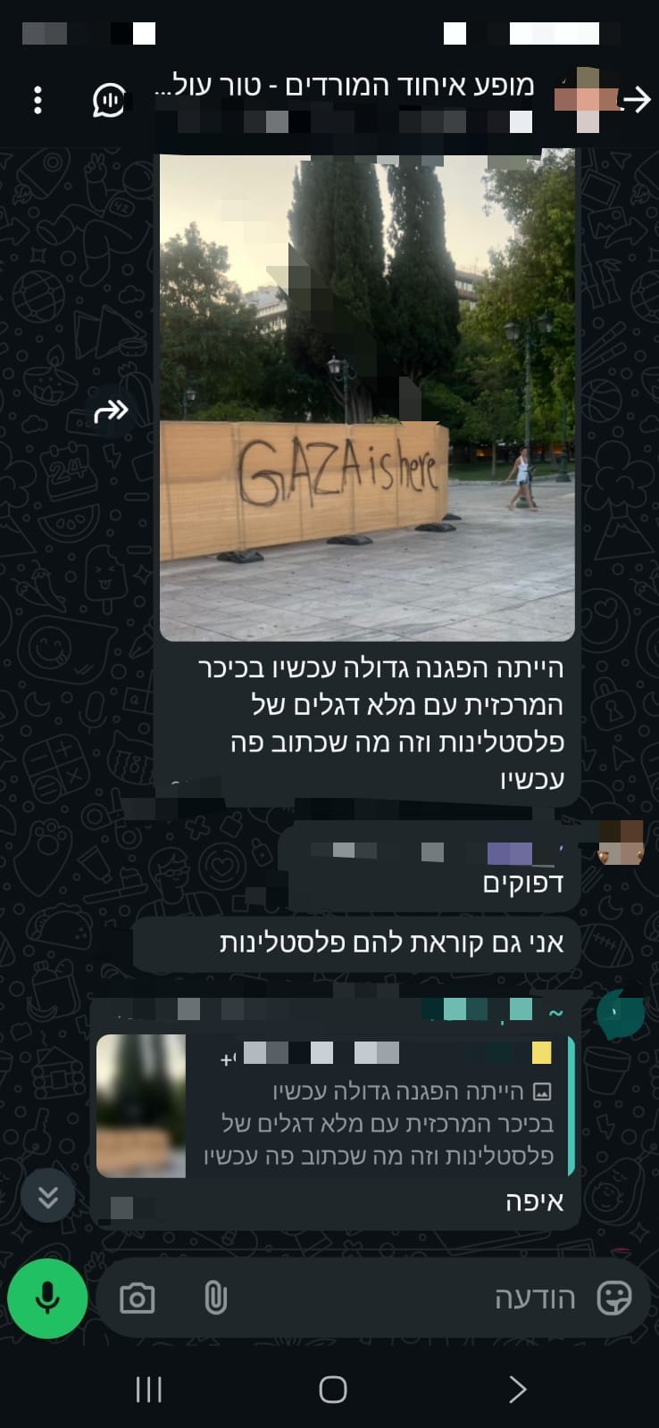 בנוסף, נשמעים דיווחים על עימותים פוליטיים ברחובות אתונה – בהם היו מעורבות צעירות ישראליות: “כן, שמעתי על אירוע לא נעים שהתרחש אתמול – תומכים פרו-פלסטינים התנכלו לבחורות ישראליות. המשטרה המקומית התערבה ועיכבה את הבנות לתחנה – כי לא נשאו עמן דרכונים. מעבר לזה, ברחובות אתונה כבר ראיתי כתובות כמו ‘Free Palestine’, ‘עזה זה כאן’ ו’ישראל מבצעת טבח עם’. חשוב מאוד לנהוג בזהירות כאן, ואני באמת מקווה שכל הישראליות יחזרו הביתה בשלום״.