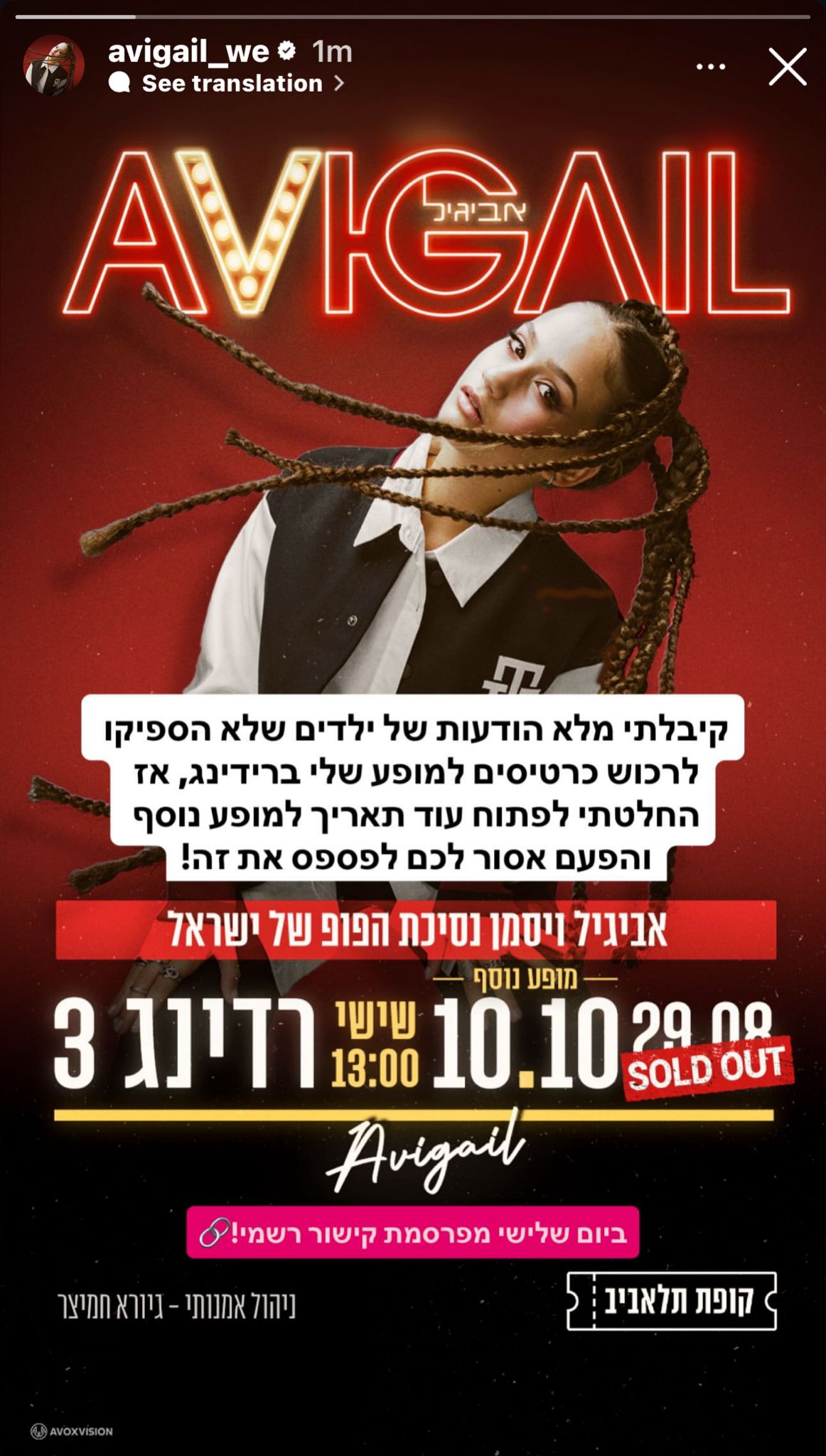 מכירת הכרטיסים להופעה השנייה נפתחה היום, והמופע יתקיים ביום שישי בתאריך ה-10.10, בשעה 13:00. על פרסום ההופעה, ויסמן כתבה היום בסטורי: "קיבלתי מלא הודעות של ילדים שלא הספיקו לרכוש כרטיסים למופע שלי ברידינג, אז החלטתי לפתוח עוד תאריך למופע נוסף והפעם אסור לכם לפספס את זה!".
