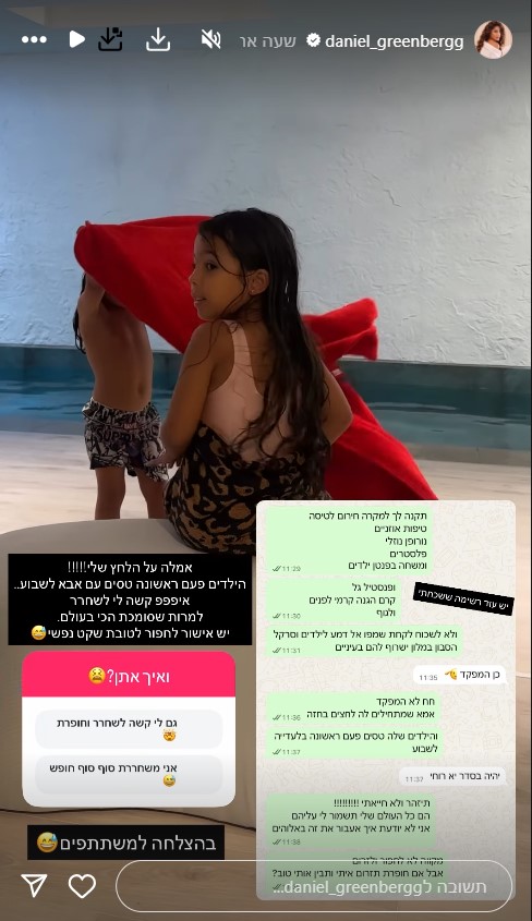 לדבריה, השניים צפויים לבלות עם אביהם בחופשה משפחתית. "אמאל'ה על הלחץ שלי. הילדים פעם ראשונה טסים עם אבא לשבוע. קשה לי לשחרר, למרות שסומכת עליו הכי בעולם. יש אישור לחפור לטובת שקט נפשי", כך כתבה גרינברג.