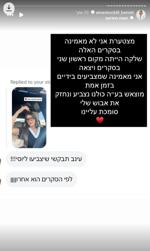 בובליל העלתה סטורי לחשבון האינסטגרם שלה, בו היא חשפה פנייה של אחת העוקבות שלה, שכתבה לה בדאגה: "עינב תבקשי שיצביעו ליוסי!! לפי הסקרים הוא מקום אחרון!!". אלא שאת בובליל זה ממש לא מדאיג.