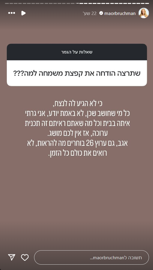 "לא הגיע לה לנצח. כל מי שחושב שכן, לא באמת יודע. אני גרתי איתה בבית וכל מה שאתם ראיתם זו תוכנית ערוכה, אז אין לכם מושג. אגב, גם בערוץ 26 בוחרים מה להראות, לא רואים את כולם כל הזמן", כך כתבה מאור ברוכמן בסטורי שפרסמה.