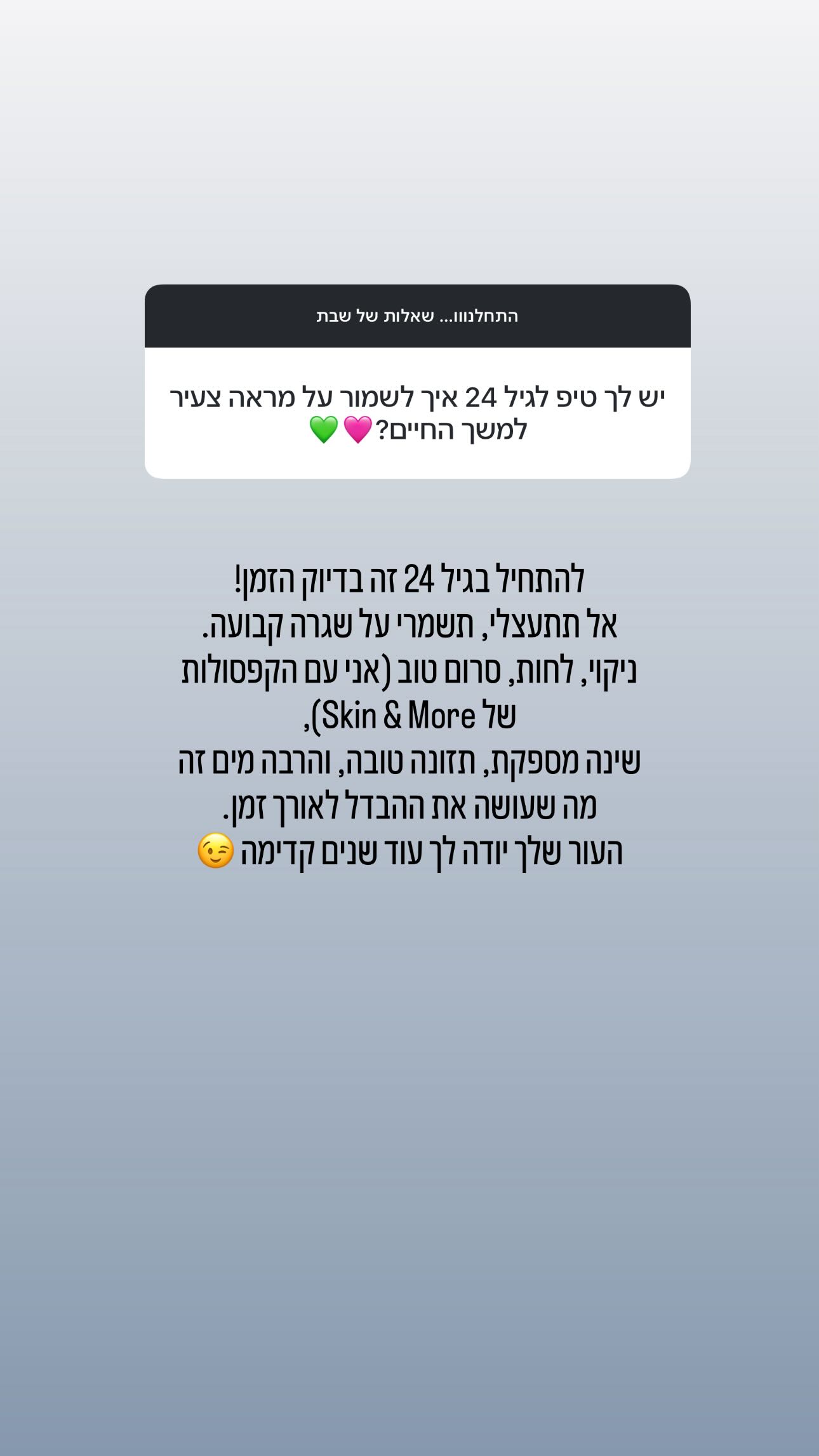 אחת העוקבות של מאור ברוכמן ביקשה לדעת כיצד ניתן לשמור על מראה צעיר לאורך זמן ומה המלצת הזהב שלה עבור בחורות בגיל 24. על כך, השיבה פליטת "האח הגדול": "להתחיל בגיל 24 זה בדיוק הזמן. אל תתעצלי, תשמרי על שגרה קבועה. ניקוי, לחות, סרום טוב, שינה מספקת, תזונה טובה והרבה מים. זה מה שעושה את ההבדל לאורך זמן העור שלך יודה לך עוד שנים קדימה".