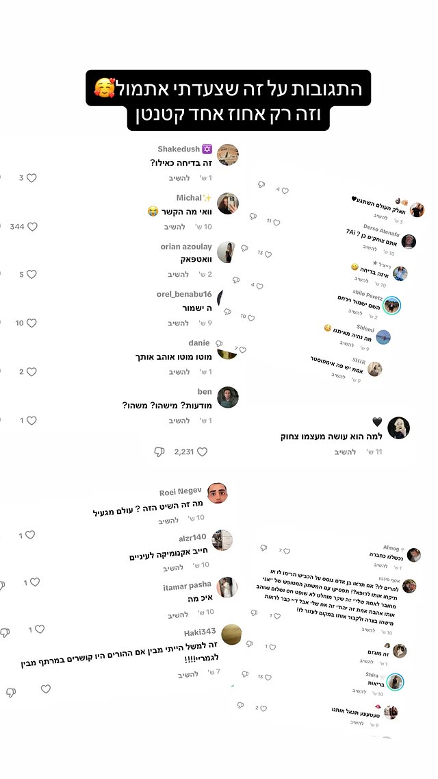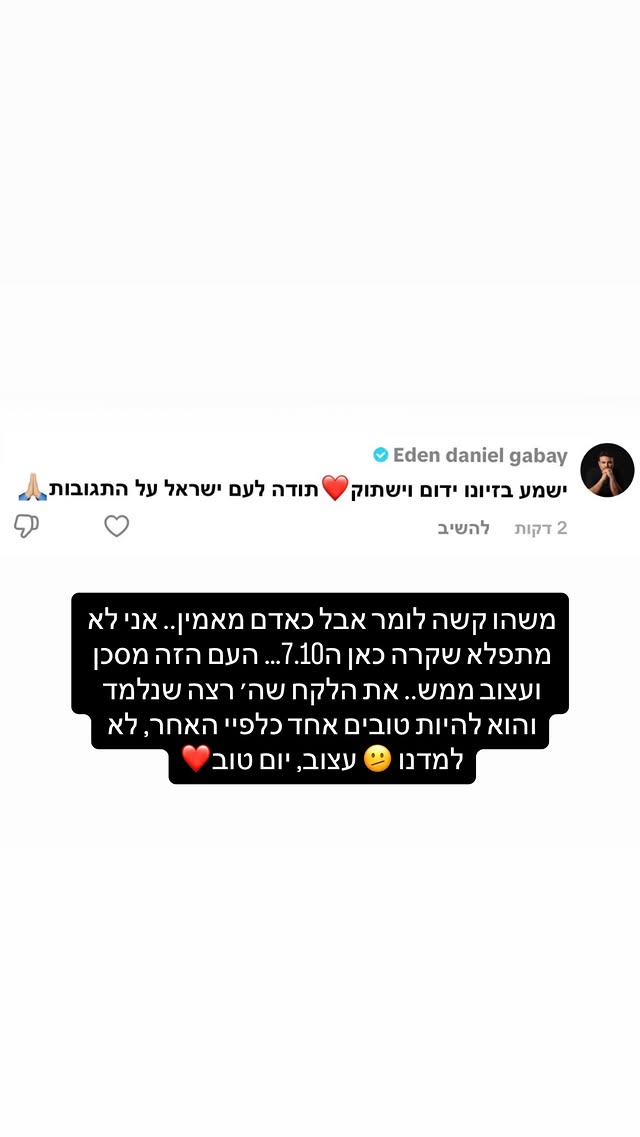 עדן דניאל גבאי המשיך והרחיב על התגובות שקיבל: "זה מצחיק אותי להגיד את זה לאנשים בוגרים, אבל אם אין לכם משהו טוב להגיד אז אל תגידו, למה אתם עושים את זה? המילים הרעות שלכם לא יניבו תוצאות. אני יודע שהתגובות שרשמו לי, לא ימנעו ממני, אבל המילים שאתם כותבים, זה הכי חמור בתורה".