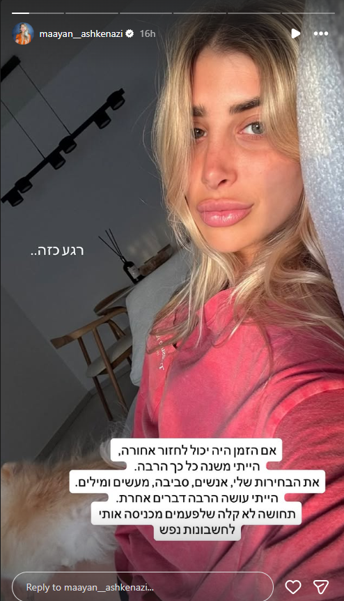 "רגע כזה", היא כתבה בחשבון האינסטגרם שלה. "אם הזמן היה יכול לחזור אחורה, הייתי משנה כלכך הרבה". אשכנזי פירטה: "את הבחירות שלי, אנשים, סביבה, מעשים ומילים". עוד הוסיפה: "הייתי עושה הרבה דברים אחרת. תחושה לא קלה שלפעמים מכניסה אותי לחשבונות נפש".
