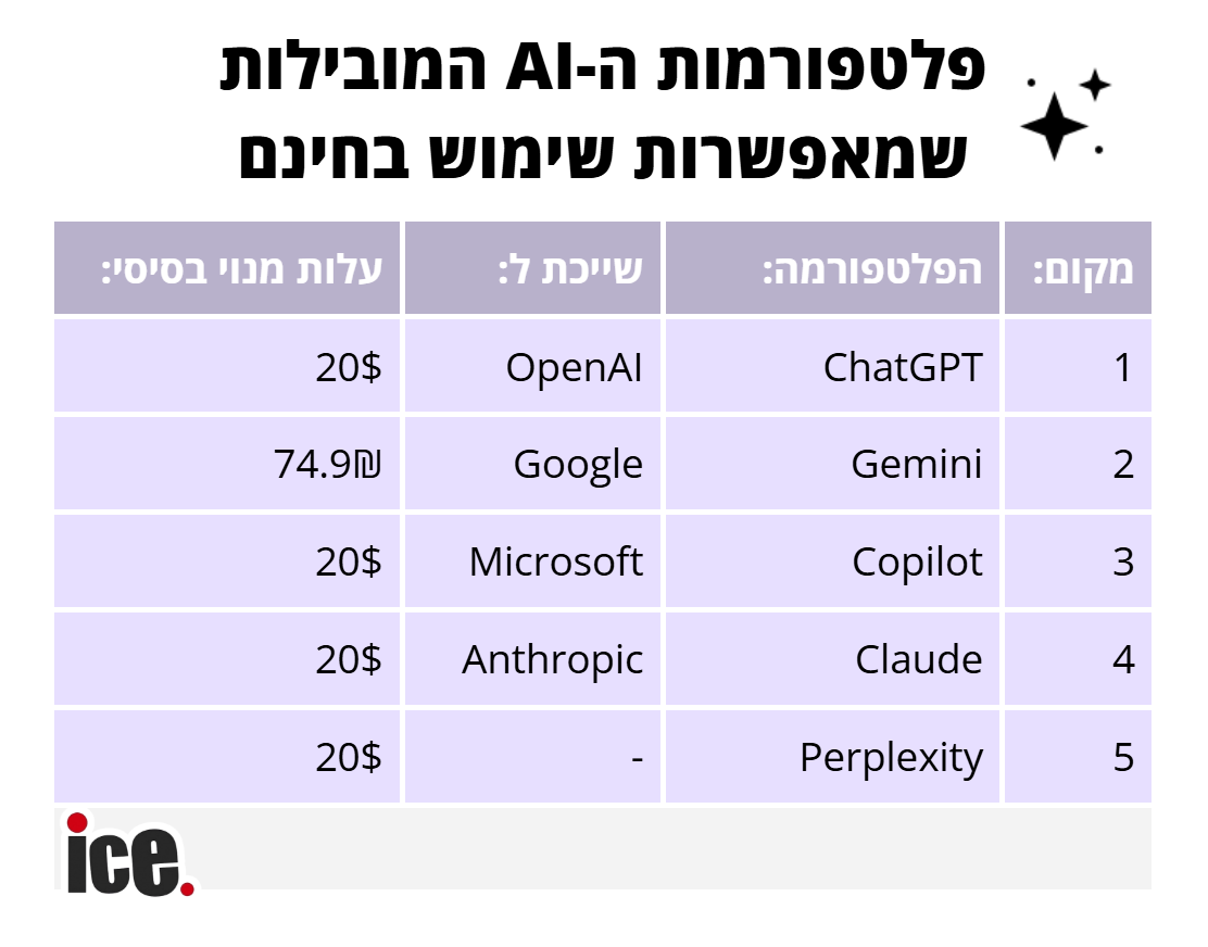במקום השלישי: Copilot – הפלטפורמה של מיקרוסופט, המשולבת בדפדפן Edge ובחלק ממוצרי 365, ומציעה יכולות דומות לאלו של ChatGPT – כולל תמיכה בהעלאת מסמכים, קלט קולי, יצירת תמונות ועוד. מיקרוסופט נהנית משיתוף פעולה הדוק עם OpenAI, ולכן מדובר בכלי עוצמתי במיוחד, שכרגע נגיש כמעט כולו בחינם.