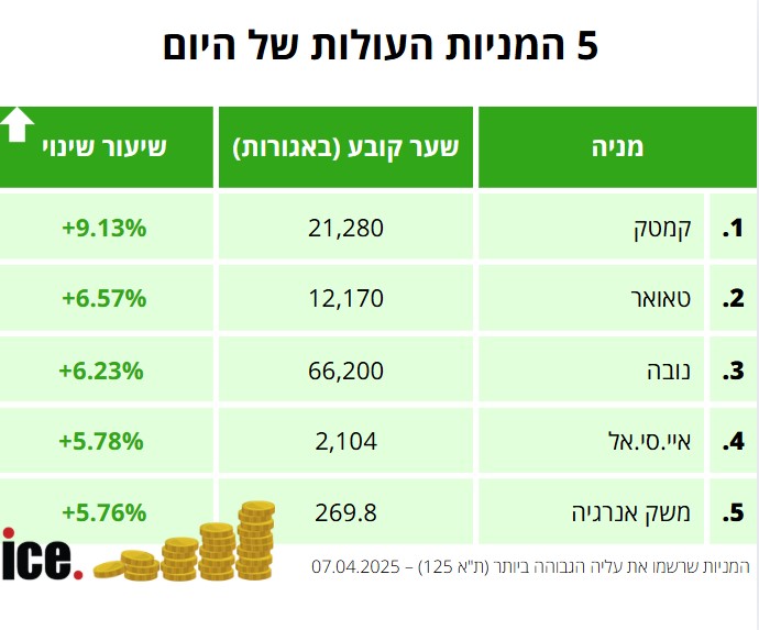 בקרב חמש המניות העולות, המנצחת היא חברת קמטק שמנייתה צמחה ב-9.13% לרמה של 21,280 אגורות. כזכור, בחודש פברואר האחרון דיווחה החברה הישראלית על הכנסות שיא של 117.3 מיליון דולר ברבעון הרביעי לשנת 2024. עוד צוין, כי הרווח הנקי על בסיס GAAP הסתכם ב-118.5 מיליון שקל, צמיחה של 51% בהשוואה לשנת 2023. מנייתה של חברת טאואר עלתה ב-6.57% לרמה של 12,170 אגורות.