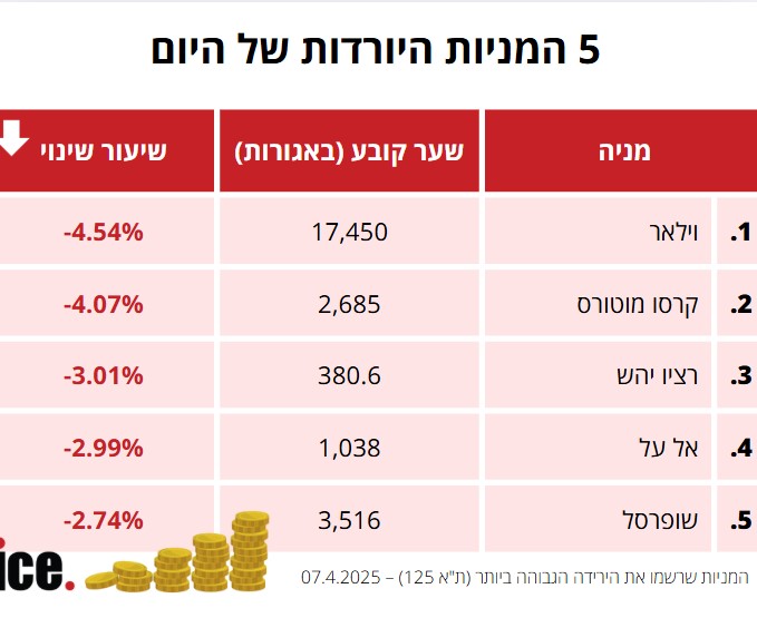 בקרב חמש המניות היורדות, המפסידה היא חברת וילאר שמנייתה צנחה ב-4.54% לרמה של 17,450 אגורות. מנייתה של חברת קרסו מוטורס ירדה ב-4.07% לרמה של 2,685 אגורות.