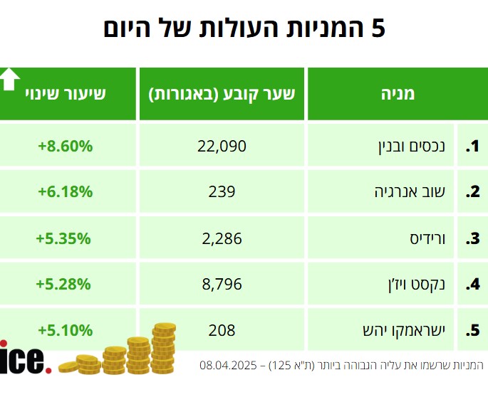בקרב חמש המניות העולות במדד ת"א 125, המנצחת היא חברת נכסים ובנין שמנייתה צמחה ב-8.60% לרמה של 22,090 אגורות. חברה נוספת שהציגה שינוי חיובי במהלך היום היא חברת שוב אנרגיה. על פי הנתונים, מנייתה של שוב אנרגיה עלתה ב-6.18% לרמה של 239 אגורות. במקום השלישי מופיעה חברת ורידיס שמנייתה גדלה ב-5.35% לרמה של 2,286 אגורות.