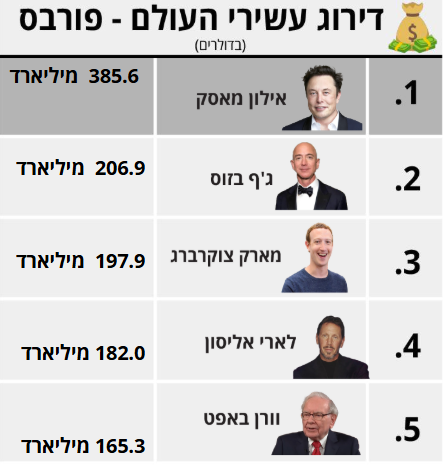 דירוג עשירי העולם של מגזין פורבס פורסם כמדי שבוע והביא עמו לא מעט הפתעות בצמרת הגבוהה. האיש העשיר ביותר בעולם, הבעלים של טסלה וטוויטר, אילון מאסק, רשם השבוע הפסדים של 923 מיליון דולר, כאשר הונו האישי מוערך כעת ב-385.6 מיליארד דולר.