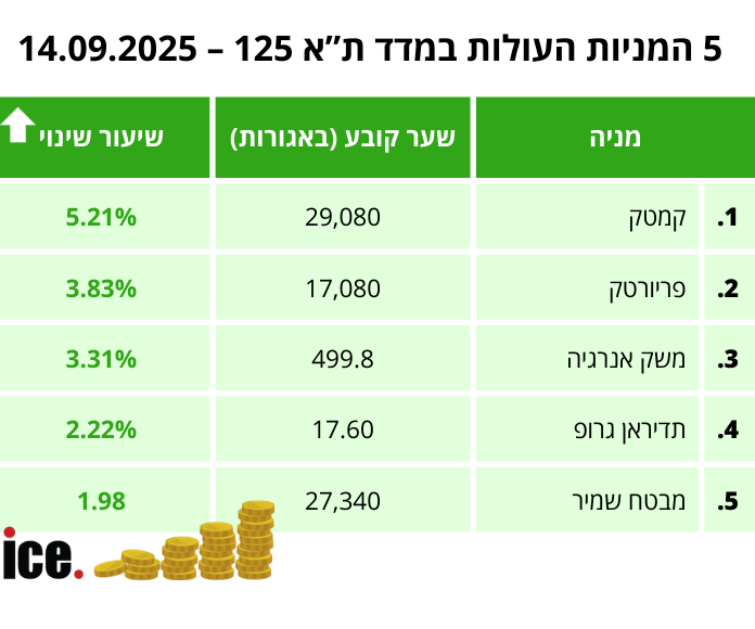 בראש רשימת המניות העולות של היום נמצאת מניית קמטק שעלתה בשיעור של 5.21% לרמה של 29,080 נקודות. במקום השני נמצאת פריורטק שעלתה בשיעור של 3.83% לרמה של 17,080 נקודות. משק אנרגיה במקום השלישי עם עלייה של 3.31% לרמה של 499.8 נקודות. תדיראן גרופ במקום הרביעי לאחר שהמניה עלתה בשיעור של 2.22% לרמה של 17.60 נקודות. סוגרת את החמישייה הראשונה מבטח שמיר שעלתה בשיעור של 1.98% לרמה של 27,340 נקודות.