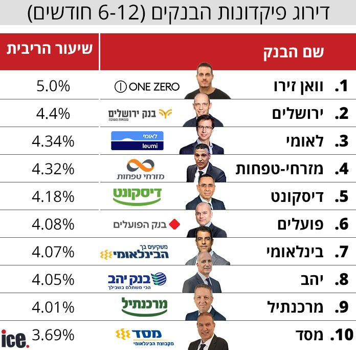 כפי שאפשר ללמוד מהטבלה, וואן זירו במקום הראשון עם ריבית של 5%. ממוצע המערכת הוא 4.2% (לעומת 4.13% בחודש שעבר). שלושה בנקים שעברו את הרף הם מלבד וואן זירו הם ירושלים, מזרחי, לאומי. בנק דיסקונט, שעבר את הרף בחודש שעבר, ירד מעט מתחתיו. מרכנתיל ומסד הם הבנקים שמשלמים את הריבית הנמוכה ביותר על פיקדון זה - 4.01%% ו-3.69% בהתאמה.