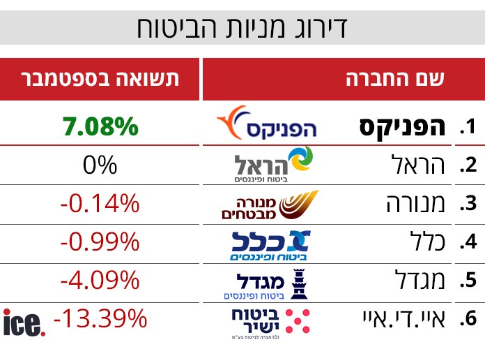 מי שבלטה לשלילה בספטמבר הייתה איי.די.איי עם נפילה של מעל 13% בספטמבר. אחריה מגדל עם ירידה של כ-4%, כלל עם ירידה של 1% ומנורה עם ירידה של כ-0.1%. הראל סיימה את החודש ללא שינוי.