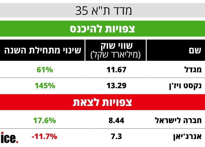 מנגד, שתי החברות שיפנו את מקומן הן אנרג'יאן - חברת האנרגיה הבריטית שפועלת במאגר כריש ונסחרת כעת בשווי של כ-7.3 מיליארד שקל, וחברה לישראל של עידן עופר, עם שווי שוק של כ-8.4 מיליארד שקל, שנפרדת מהמדד למרות תפקידה ההיסטורי והשליטה בחברת ICL.