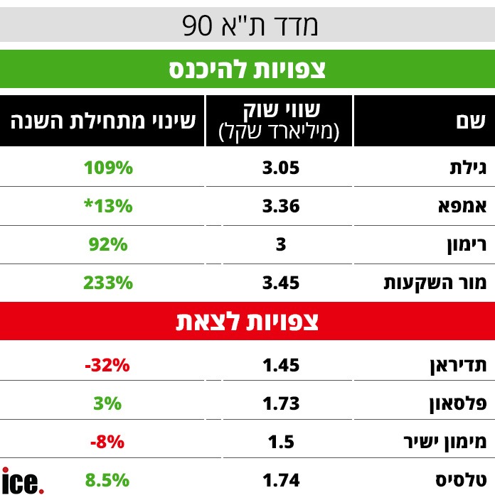 הנכנסות הנוספות לת"א 90 הן גילת לוויינים - עם זינוק של 109% השנה ופי 3.5 מאז העדכון הקודם, רימון לאחר עלייה של כ-92% מתחילת השנה לשווי של 3 מיליארד שקל, ואמפא שהונפקה לאחרונה ונכנסת עם שווי שוק של כ-3.36 מיליארד שקל.
