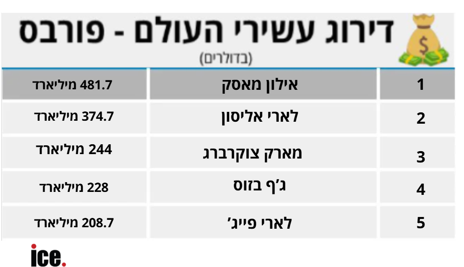 מייסד אמזון, ג'ף בזוס עם הון המוערך ב-228 מיליארד דולר - מחיקה של 11 מיליארד דולר משבוע שעבר, אז הונו היה מוערך בשווי של 239 מיליארד דולר. סוגר את החמישייה: לארי פייג' עם הון המוערך בשווי של 208.7 מיליארד דולר - עלייה משבוע שעבר אז הונו היה מוערך ב-201.1 מיליארד דולר.